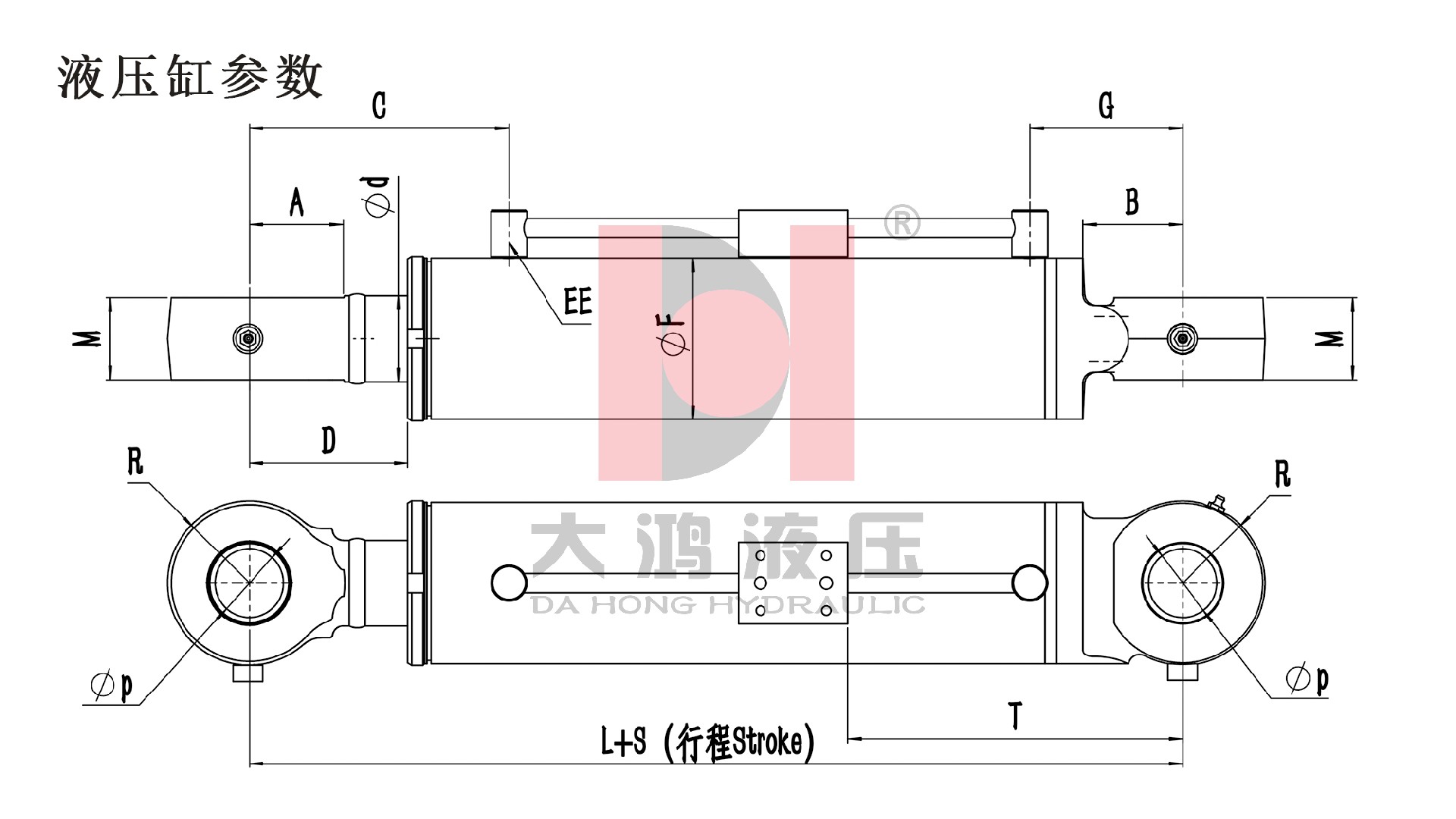 ΦD bore diameter | Φd rod diameter | EE Tubing connection | A | B | D | C | ΦF | G | T(≥G+63) | L | M | Φp | R |